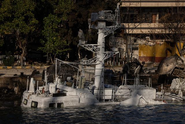 △以色列对叙利亚拉塔基亚口岸进行空袭后,叙利亚战舰被毁。